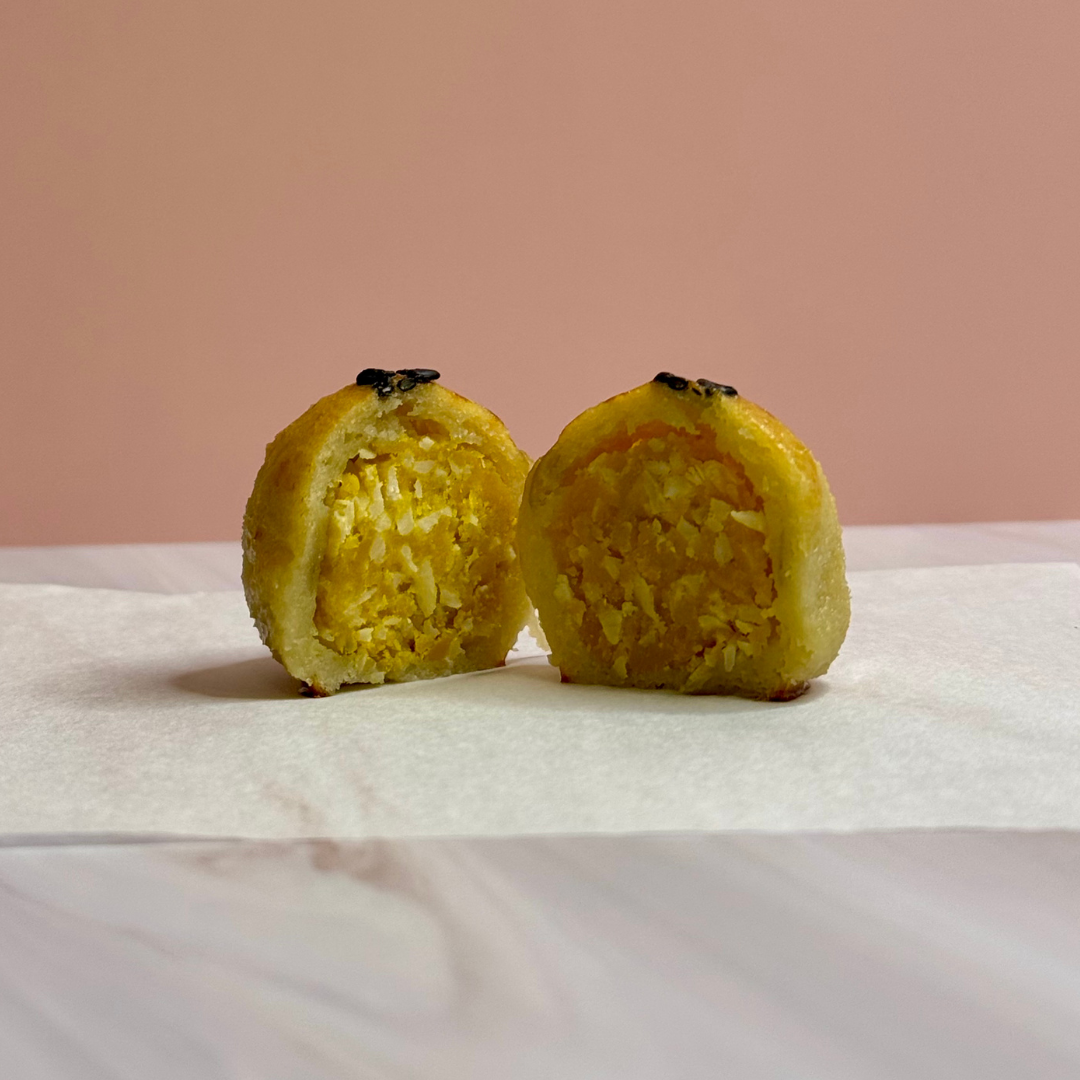 - Sweet Potato Manju Truffle - Sweet potato, kabocha squash, rice flour, shredded coconut, milk, egg, black sesame